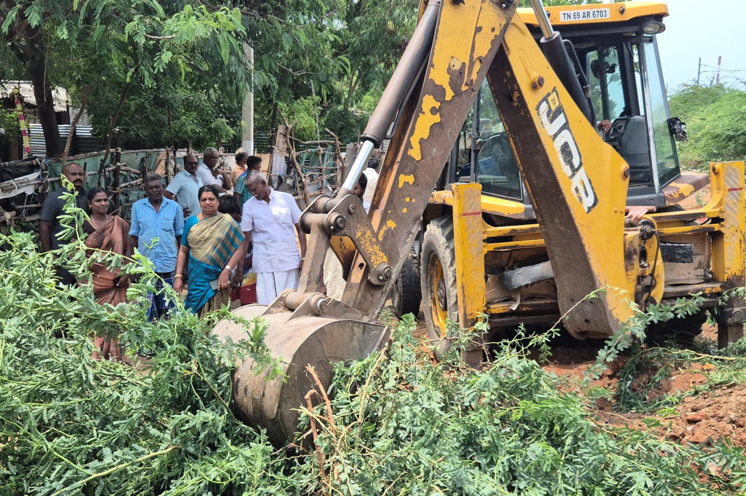 கருவேல மரங்கள் முள்செடிகளை ஜேசிபி மூலம் தனது சொந்த செலவில் அகற்றும் பணியையும் அமைச்சர் கீதாஜீவன் மேற்கொண்டு ஆய்வு செய்தார்.