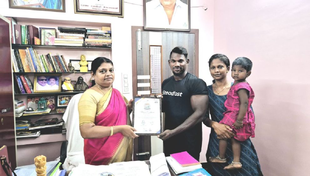சர்வதேச அளவிலான ஆணழகன் போட்டியில் வெற்றி பெற்றவர் அமைச்சர் கீதாஜீவனிடம் வாழ்த்து பெற்றார்.