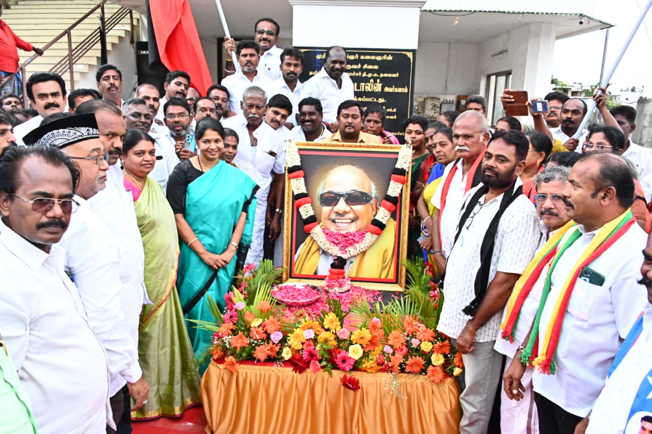 கனிமொழி எம்.பி கலைஞர் அரங்கம் முன்புள்ள கலைஞர் கருணாநிதி சிலைக்கும் மற்றும் அலங்காிக்கப்பட்ட அவரது படத்திற்கு மாலை அணிவித்து மாியாதை செய்து
