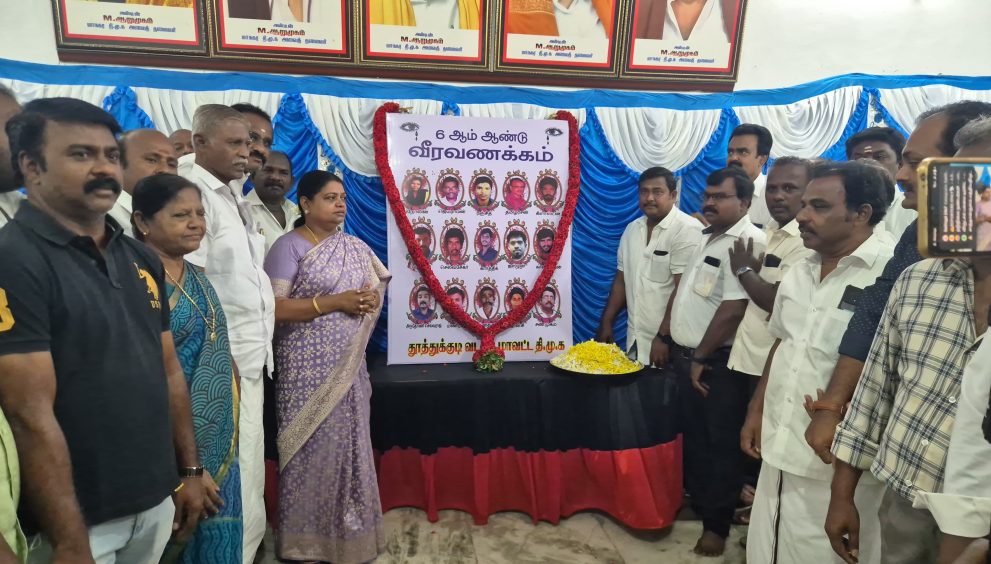 தூத்துக்குடி ஸ்டெர்லைட் எதிர்ப்பு போராட்டத்தில் துப்பாக்கி சூட்டில் உயிரிழந்த 13பேர் மற்றும் மருத்துவமனையில் அனுமதிக்கபப்ட்டு இருவர் உயிாிழந்தவர்களின் 6ம் ஆண்டு நினைவு நாளை முன்னிட்டு வடக்கு மாவட்ட திமுக சார்பில் கலைஞர் அரங்கில் வைக்கப்பட்டிருந்த 15 பேர் படத்திற்கு வடக்கு மாவட்ட திமுக செயலாளரும் சமூகநலன் மற்றும் மகளிர் உாிமைத்துறை அமைச்சர் கீதாஜீவன் மலர் அஞ்சலி செலுத்தினார்.