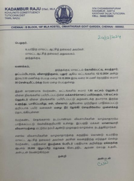 கடந்த 12.12.2024 அன்று பெய்த பெரு மழையினால் கயத்தாறு, கோவில்பட்டி, ஓட்டப்பிடாரம், விளாத்திகுளம், புதூர் ஆகிய வட்டங்களில் பயிரிடப்பட்டு அறுவடைக்கு தயாராக இருந்த மானாவாரி பயிர்கள் பெரும் சேதமடைந்து விவசாயிகள் கடுமையாக பாதிக்கப்பட்டுள்ளனர். மழையினால் பாதிக்கப்பட்ட பயிர்களுக்கு ஏக்கருக்கு ரூபாய் 25 ஆயிரம் வழங்க வேண்டும் என்று முன்னாள் அமைச்சரும் கோவில்பட்டி சட்டமன்ற உறுப்பினருமான கடம்பூர் செ.ராஜூ, தூத்துக்குடி மாவட்ட ஆட்சியர் இளம் பகவத்தினை நேரில் சந்தித்து கோரிக்கை மனுவினை வழங்கினர்.