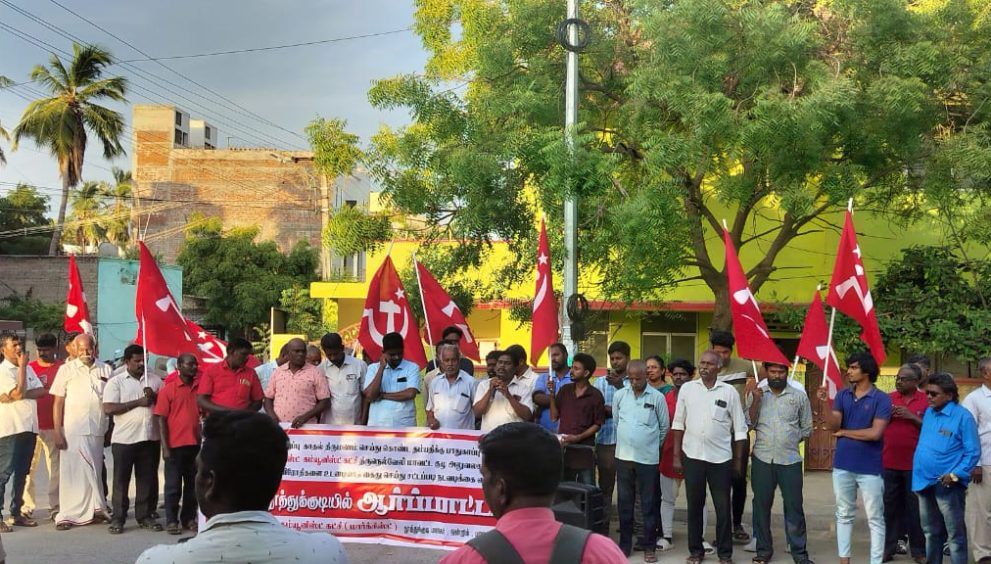 ஜாதி மறுப்பு காதல் திருமணம் செய்து கொண்ட தம்பதிக்கு பாதுகாப்பு வழங்கிய மார்க்சிஸ்ட் கம்யூனிஸ்ட் கட்சி அலுவலகத்தை தாக்கிய சமூக விரோதிகளை கைது செய்து சட்டப்படி நடவடிக்கை எடுக்க வலியுறுத்தி மார்க்சிஸ்ட் கம்யூனிஸ்ட் கட்சியின் தூத்துக்குடி மாநகர், ஒன்றியம், புறநகர் கமிட்டிகள் சார்பில் சிதம்பரம் நகர் பஜாரில் கண்டன ஆர்ப்பாட்டம் நடைபெற்றது. இதற்கு மார்க்சிஸ்ட் கம்யூனிஸ்ட் கட்சியின் தூத்துக்குடி மாநகர் செயலாளர் எம்.எஸ்.முத்து தலைமை வகித்தார். ஒன்றிய செயலாளர் கே.சங்கரன், புறநகர் செயலாளர் முனியசாமி ஆகியோர் முன்னிலை வகித்தனர். மாவட்ட செயற்குழு உறுப்பினர்கள் ஆர்.ரசல், தா.ராஜா, ஆர்.பேச்சிமுத்து, மாவட்டக்குழு உறுப்பினர்கள் காசி, சொ.மாரியப்பன், ரவி தாகூர், சுரேஷ், முன்னாள் மாவட்ட செயலாளர் இசக்கி முத்து, மூத்த தோழர் பொன் ராஜ், மாநகர் குழு உறுப்பினர்கள் ஆறுமுகம், ராமமூர்த்தி, தசலிஸ், காஸ்ட்ரோ, ஶ்ரீ நாத், ஒன்றியக்குழு, புறநகர் குழு உறுப்பினர்கள் உட்பட பலர் கலந்து கொண்டனர்.