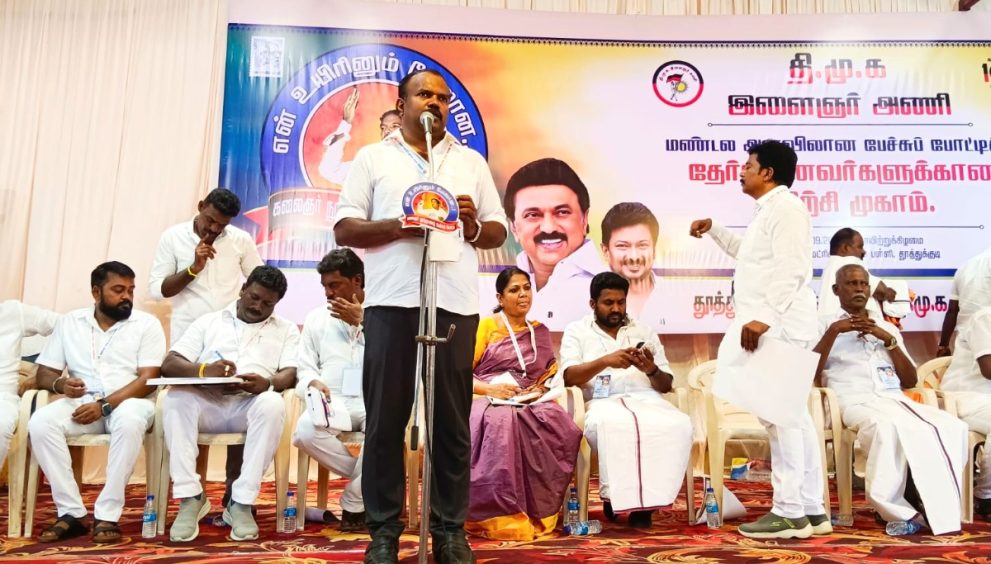 தூத்துக்குடி வடக்கு மாவட்ட திமுக இளைஞர் அணி சார்பில், திமுக மாநில இளைஞரணி செயலாளர் உதயநிதி ஸ்டாலின் அறிவுறுத்தலின்படி முத்தமிழ் அறிஞர் கலைஞர் நூற்றாண்டு விழா பேச்சுப்போட்டிகளுக்கு, மண்டல அளவிலான பேச்சுப் போட்டிக்கு தேர்வானவர்களுக்கான பயிற்சி முகாம் தூத்துக்குடி போல்பேட்டை கீதா மெட்ரிகுலேஷன் பள்ளியில் நடைபெற்றது .
