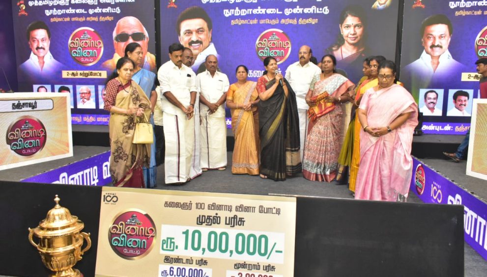 தஞ்சாவூர் திமுக மகளிர் அணி மற்றும் கலைஞர் நூற்றாண்டைக் கொண்டாடும் வகையில், திராவிட இயக்க வரலாற்றையும் கொள்கைகளையும் அடுத்த தலைமுறைக்குக் கொண்டு செல்லும் வகையில் திமுக துணைப் பொதுச் செயலாளரும்,நாடாளுமன்ற குழுத் தலைவருமான கனிமொழி கருணாநிதி முன்னெடுப்பில் நடைபெறும் ‘கலைஞர் 100 வினாடி வினா’ போட்டியின் மண்டல அளவிலான இரண்டாம் கட்ட போட்டி இன்று (20/09/2024) தஞ்சாவூர் குருதயாள் சர்மா கல்யாண மண்டபத்தில் நடைபெற்றது.