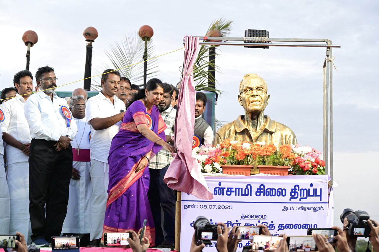 திருச்சி விரகாலூரில் ஸ்டேன் சாமி சிலையை கனிமொழி எம்பி, திருமாவளவன் எம்பி, திறந்து வைத்தனர்