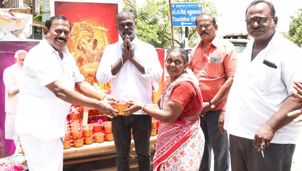 தூத்துக்குடி டூவிபுரத்தில் விநாயகா் சதூா்த்தி விழாவையொட்டி முன்னாள் அதிமுக அமைச்சா் சி.த.செல்லப்பாண்டியன் பக்தர்களுக்கு உணவு வழங்கினார்.