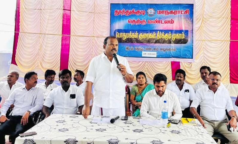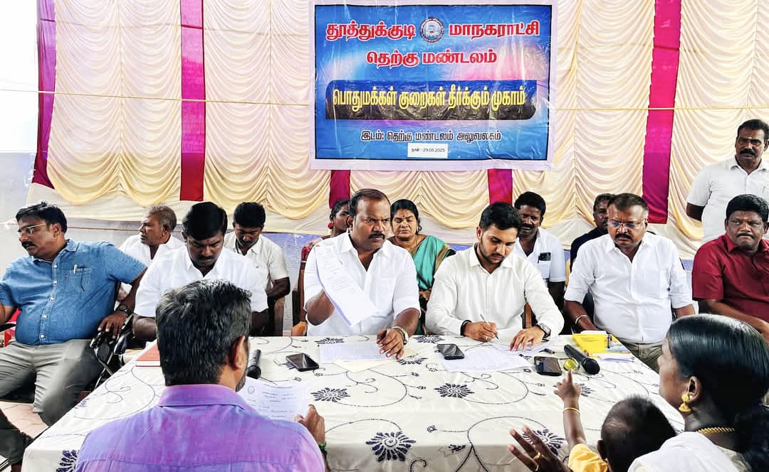 தூத்துக்குடி மாநகராட்சி தெற்கு மண்டல அலுவலகத்தில் நடைபெற்ற பொதுமக்கள் குறைதீர்க்கும் முகாமிற்கு மேயர் ஜெகன் பொியசாமி தலைமை வகித்தார். ஆணையர் மதுபாலன் முன்னிலை வகித்தாா். மண்டல தலைவர் வக்கீல் பாலகுருசாமி வரவேற்புரையாற்றினார்.