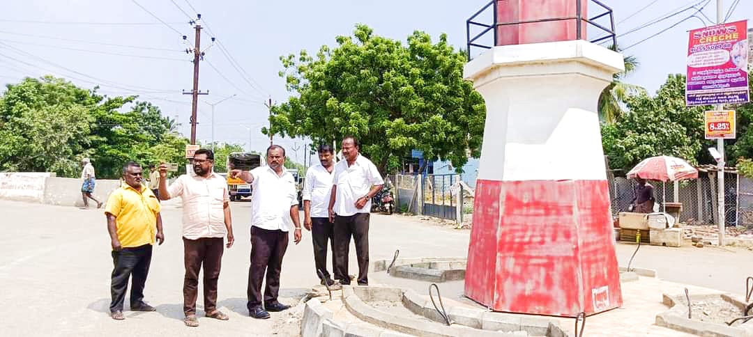 டீச்சர்ஸ் காலனி ரவுண்டானா அழகு படுத்தும் பணிகளை மேயர் ஜெகன் பெரியசாமி ஆய்வு செய்தபோது. உடன் கவுன்சிலர் சந்திரபோஸ்.