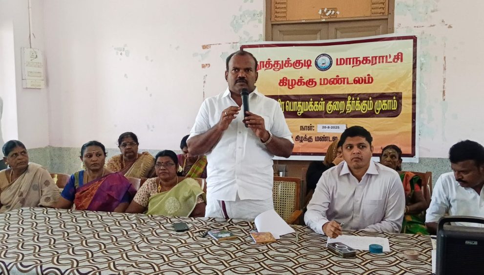 தூத்துக்குடி மாநகராட்சி கிழக்குமண்டலத்தில் 20.08.25 அன்று நடைபெற்ற மக்கள் குறைதீர்க்கும் முகாமிற்கு மேயர் ஜெகன் பெரியசாமி தலைமை தாங்கினார், மாநகராட்சி ஆணையர் பானோத் ம்ருகேந்தர் லால், துணை மேயர் செ.ஜெனிட்டா முன்னிலை வகித்தனர்.மண்டல தலைவர் கலைச்செல்வி வரவேற்றார்.முகாமில் கிழக்கு மண்டலத்திற்குட்பட்ட 15 வார்டுகளில் பகுதிகளில் வசிக்கும் பொதுமக்கள், வியாபாரிகள் கலந்து கொண்டு சொத்து வரி நிர்ணயம், பெயர் மாற்றம், புதிய குடிநீர் இணைப்பு, தண்ணீர் உபயோக கட்டண விகிதங்கள் மாற்றம், கட்டிட அனுமதி, ஆக்கிரமிப்புகள் அகற்றுதல், தொழில் வரி, பாதாள சாக்கடை உள்ளிட்ட மாநகராட்சி சேவைகள் குறித்து கோரிக்கை மனுக்களை மேயர் ஜெகன் பெரியசாமியிடம் வழங்கினார்கள்.