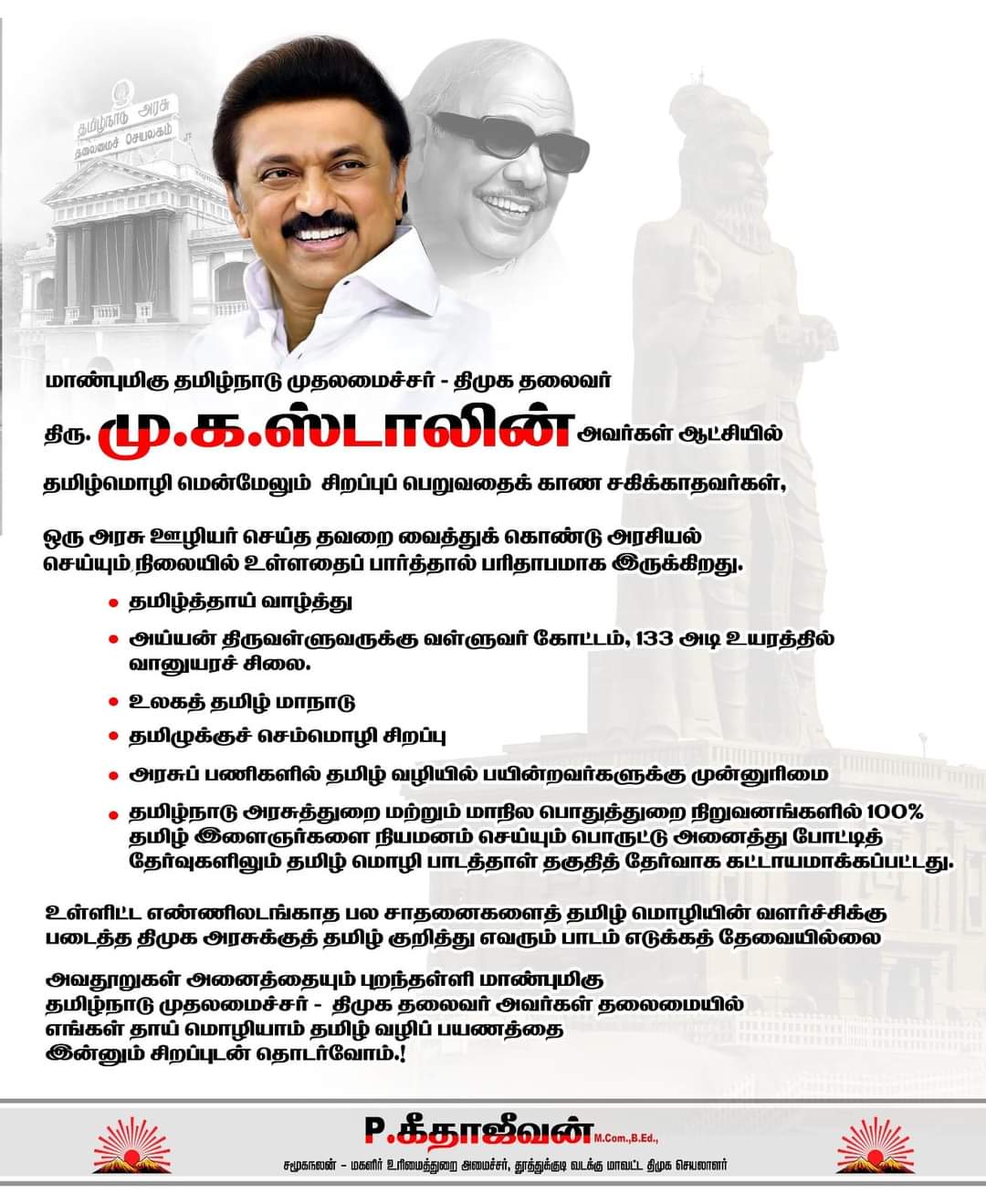 தமிழ்த்தாய் வாழ்த்து, அய்யன் திருவள்ளுவருக்கு வள்ளுவர் கோட்டமும், 133 அடியில் வானுயர சிலையும் அமைத்தது, உலகத் தமிழ் மாநாடு நடத்தியது, தமிழுக்கு செம்மொழி சிறப்பு பெற்றுத் தந்தது என எண்ணிலடங்கா பெருமைகள் கொண்டது தான் திராவிட முன்னேற்றக் கழக வரலாறு.
