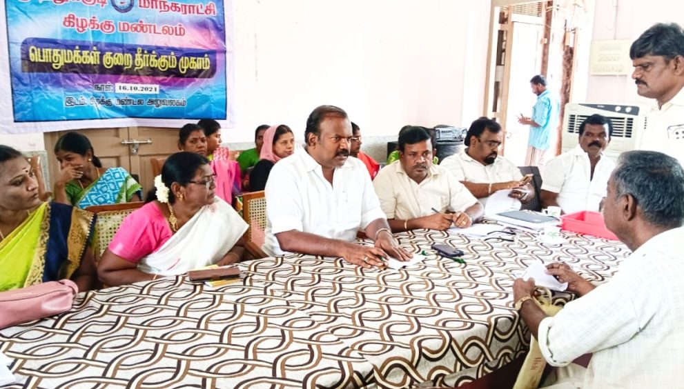 தூத்துக்குடி மாநகராட்சி கிழக்குமண்டலத்தில் 16.10.24 அன்று நடைபெற்ற மக்கள் குறைதீர்க்கும் முகாமிற்கு மேயர் ஜெகன் பெரியசாமி தலைமை தாங்கினார். துணை மேயர் ஜெனிட்டா, துணை ஆணையர் ராஜாராம் முன்னிலை வகித்தனர். கிழக்கு மண்டல தலைவர் கலைச்செல்வி வரவேற்றார்.