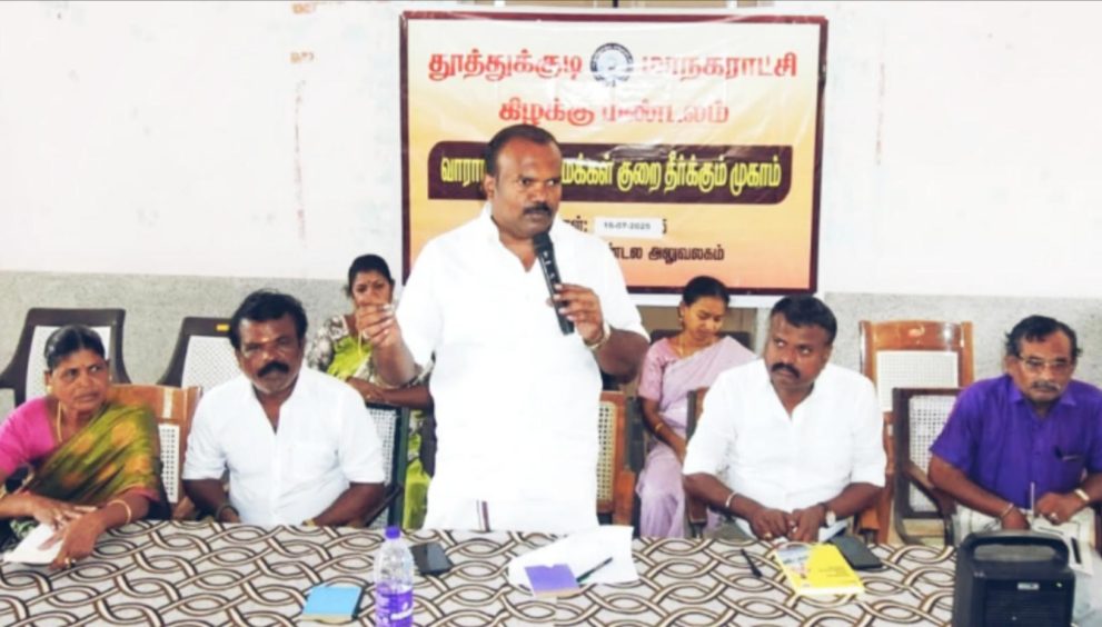 தூத்துக்குடி மாநகராட்சியில், தமிழ்நாடு முதலமைச்சர் மு.க.ஸ்டாலின் உத்தரவின்படி மக்கள் குறைதீர்க்கும் முகாம் மண்டல வாரியாக ஒவ்வொரு வாரமும் நடைபெற்று வருகிறது.தூத்துக்குடி மாநகராட்சி கிழக்குமண்டலத்தில் 16.07.25 அன்று நடைபெற்ற மக்கள் குறைதீர்க்கும் முகாமிற்கு மேயர் ஜெகன் பெரியசாமி தலைமை தாங்கினார், மாநகராட்சி துணை ஆணையர் சரவணகுமார் முன்னிலை வகித்தார்.