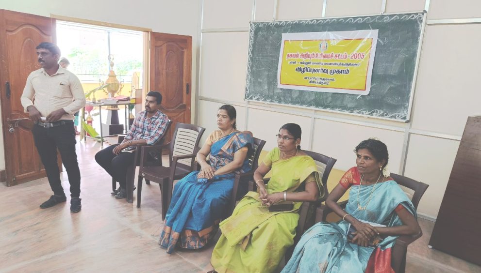 இதில் விளாத்திகுளம் தலைமையிடத்து துணை தாசில்தார் சரஸ்வதி,ஆர்ஐ ராணி ஆகியோர் சிறப்பு விருந்தினராக கலந்து கொண்டு தகவல் அறியும் உரிமைச் சட்டம் தொடங்கப்பட்டதன் முக்கிய நோக்கம், அதனை பயன்படுத்தும் முறை, தகவல் அறியும் உரிமம் சட்டத்தின் கீழ் வரும் அரசு துறைகள் பற்றியும் வராத துறைகள் பற்றியும், எவ்வாறு பொது தகவல்களை பெற வேண்டும், எத்தனை நாட்களுக்குள் தகவல் பெற முடியும் என்பது பற்றியும் விரிவாக எடுத்துக் கூறினர்.