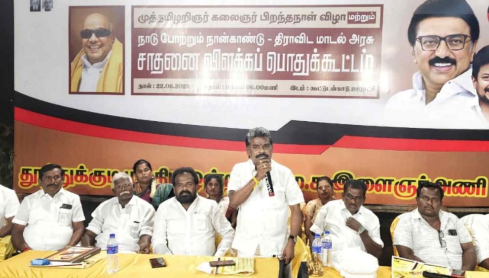 தூத்துக்குடி தெற்கு மாவட்ட தி.மு.க சார்பில் தூத்துக்குடி மத்திய ஒன்றிய திமுக இளைஞர் அணி சார்பில் கலைஞர் பிறந்தநாள் விழா – நான்காண்டு சாதனை விளக்க பொதுக்கூட்டம் அய்யனார் குளம் பகுதியில் நடைபெற்றது. மத்திய ஒன்றிய இளைஞர் அணி அமைப்பாளர் சண்முக நாராயணன் தலைமையில், துணை அமைப்பாளர்கள் ராஜ் , பொன் யோசுவா, சங்கர், வடிவேல் நாதன், விஜய் செல்வராஜ் ,ஆகியோர் முன்னிலையில் நடைபெற்றது. மாவட்ட பிரதிநிதி வெயில்ராஜ் வரவேற்புரையாற்றினார். கூட்டத்தில் ஓட்டப்பிடாரம் சட்டமன்ற உறுப்பினர் எம்.சி.சண்முகையா, ஒன்றிய செயலாளர் சிறப்புரையாற்றினார்.