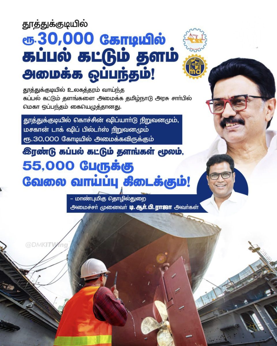 இந்நிலையில், தூத்துக்குடியில் ரூ.30,000 கோடி முதலீட்டில் உலகத்தரம் வாய்ந்த இரண்டு கப்பல் கட்டும் தளங்கள் அமைக்கப்பட உள்ளதாக தொழில், முதலீட்டு ஊக்கவிப்பு மற்றும் வர்த்தகத் துறை அமைச்சர் டி.ஆர்.பி.ராஜா தெரிவித்தார்.
