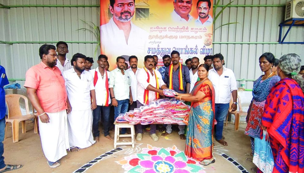 சமத்துவ பொங்கல் விழாவில் கலந்து கொண்ட பெண்களுக்கு தமிழக வெற்றி கழக நிர்வாகி ஆனந்தகுமார் பொங்கல் பரிசாக சேலைகள் வழங்கினார். தூத்துக்குடி மாநகர சமத்துவ பொங்கல் விழாவிற்கான ஏற்பாடுகளை ஆனந்தகுமார் சிறப்பாக செய்திருந்தார்.