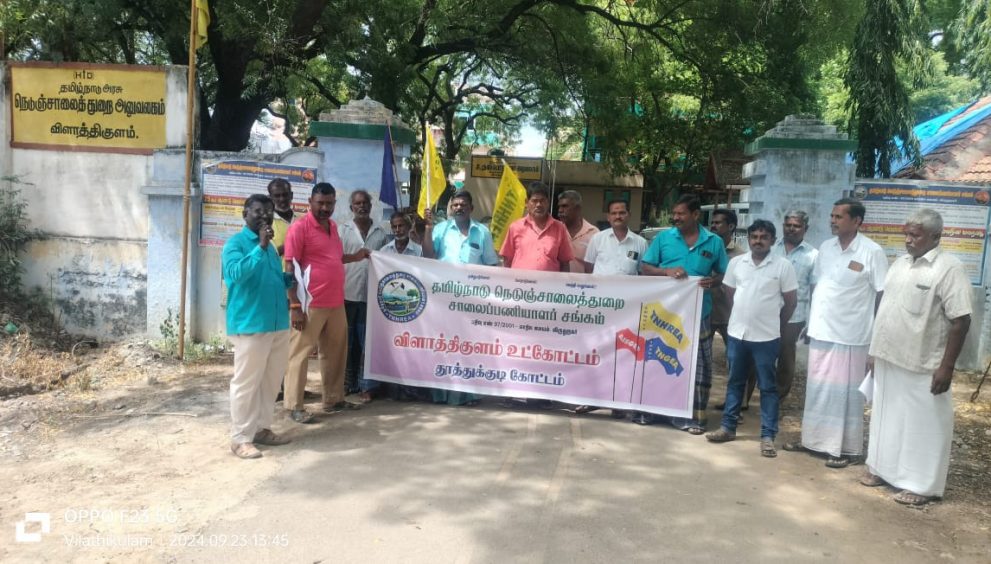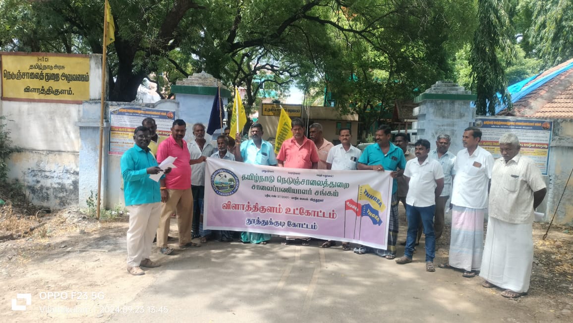 தமிழ்நாடு நெடுஞ்சாலைத்துறை சாலை பணியாளர் சங்கம் விளாத்திகுளம் உட்கோட்டம் சார்பில் விளாத்திகுளம் உதவி கோட்ட பொறியாளர் அலுவலகம் வளாகத்தில் வைத்து நடைபெற்ற ஆர்ப்பாட்டத்திற்கு தமிழ்நாடு நெடுஞ்சாலைத்துறை சாலை பணியாளர் சங்கம் விளாத்திகுளம் உட்கோட்ட தலைவர் கண்ணன் தலைமை வகித்தார்.உட்கோட்ட இணைச் செயலாளர் ராஜசேகர் முன்னிலை வகித்தார்.கோட்டத் தலைவர் பரணிதரன் தொடக்க உரையாற்றினார்.உட்கோட்ட செயலாளர் முருகன் கோரிக்கை விளக்க உரையாற்றினார்.மாநில செயலாளர் ஹரிபாலன்,உட்கோட்ட துணைத் தலைவர் கண்ணன் ஆகியோர் நிறைவுரையாற்றினார்.