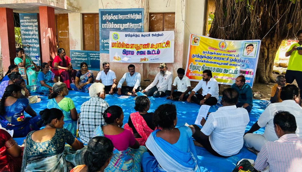 அதன் படி தமிழக அரசின் வழிகாட்டுதலின் படி தெற்கு மாவட்ட திமுக செயலாளரும் மீன்வளம் மீனவர் நலன் மற்றும் கால்நடைபராமாிப்பு துறை அமைச்சர் அனிதா ராதாகிருஷ்ணன் ஆலோசனையின் போில் தூத்துக்குடி மாவட்டம் ஓட்டப்பிடாரம் சட்டமன்ற தொகுதிக்குட்பட்ட மாப்பிள்ளையூரணி ஊராட்சியில் சிறப்பு கிராமசபை கூட்டம் ஊராட்சி மன்ற தலைவர் சரவணக்குமார் தலைமையில் நடைபெற்றது. கூட்டத்திற்கு தூத்துக்குடி ஊராட்சி ஒன்றிய பணி மேற்பார்வையாளர் முத்துராமன் முன்னிலை வகித்தார். ஊராட்சிக்குட்பட்ட பொதுமக்கள் கலந்து கொண்டு பல்ேவறு கருத்துக்களை தொிவித்து ஊராட்சி மன்ற தலைவருடன் கலந்துரையாடல் செய்தனர்.